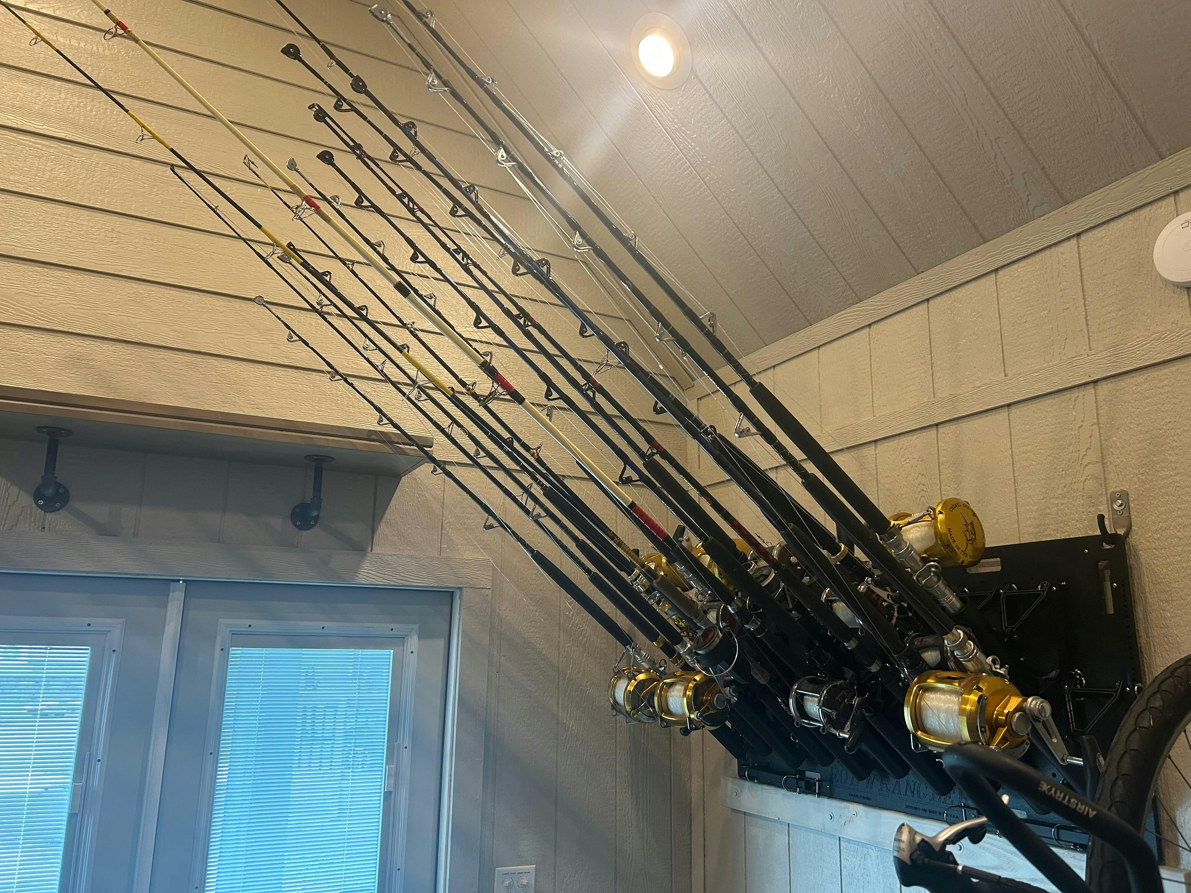 Then I figured why not use it to store my rods and reels when I am home? Worked out perfectly! I did add an extra two braces to keep it from bowing and now all of my offshore rods are off the deck and safely out of the way.