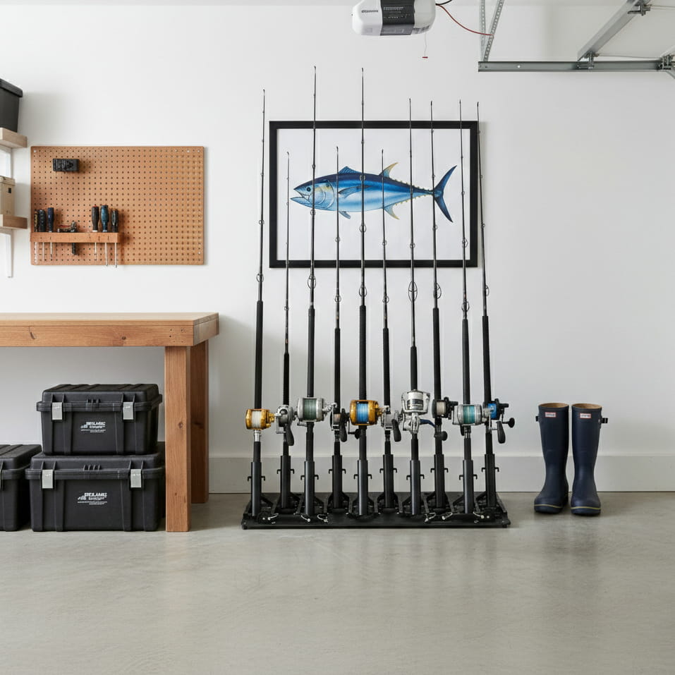 - Save time and energy with a multi-use system. Store and organize fishing rods in your garage and efficiently wash down your rods and reels inside the system.